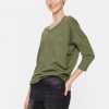 blúz 3/4-es ujjal és V-nyakkivágással. a blúz kötött minőségben, bő szabású.camilla 176 cm és m-es méretet visel.