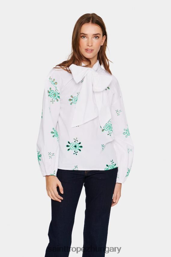 fehér ing zöld hímzéses anglasie részletekkel, levehető szalaggal a nyakkivágásnál, jól látható gombos záródással és hosszú ujjú elasztikus szegéllyel. az ing bő szabású és szőtt minőségű. Clara 177 cm és m-es méretet visel.