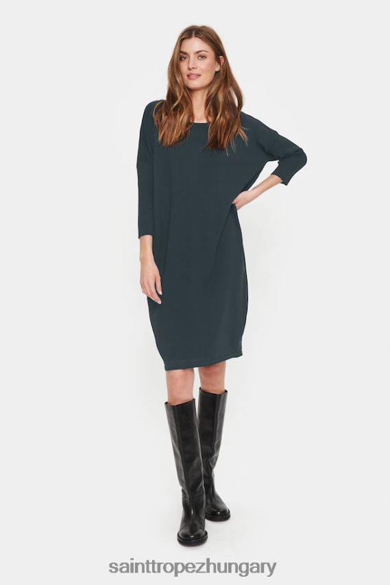 térdig érő kötött ruha lezser fazonban, kerek nyakkivágással és 3/4 hosszú ujjakkal. a ruha nyakánál és ujjánál bordázott. A modell M-es méretet visel.